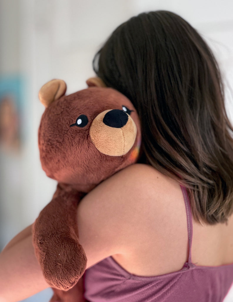 By popular demand from you, our community, Darby the Bear, an OG Hugimal and the sweetest chocolate brown bear, has come out of hibernation and is ready to give you and yours many comforting hugs. Now shipping.